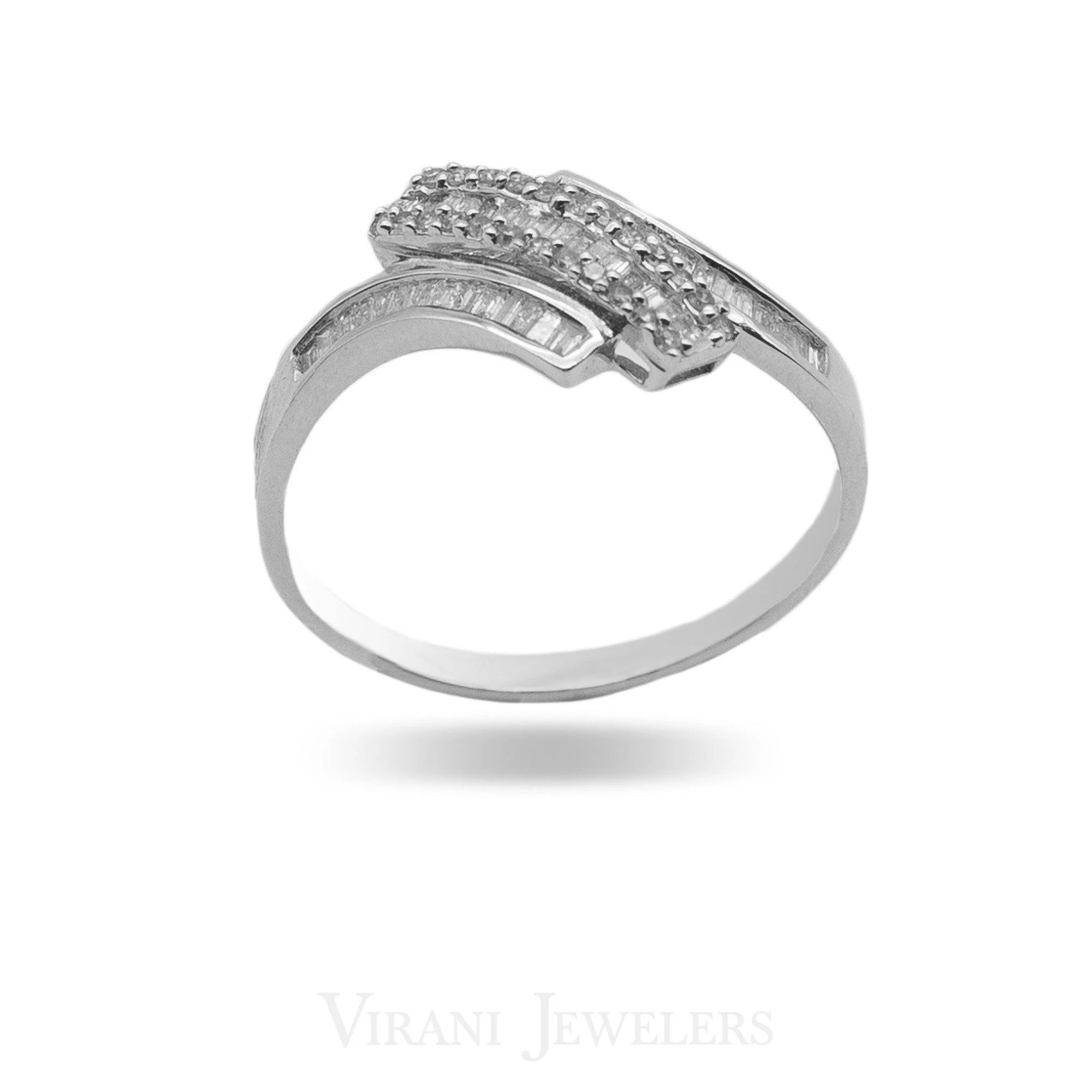 This baguette diamond crossover ring is an on-trend, yet classic, jewelry piece for everyday wear. It features three rows of prong-set diamonds that sparkle endlessly. Gold weight is 2.1 grams.