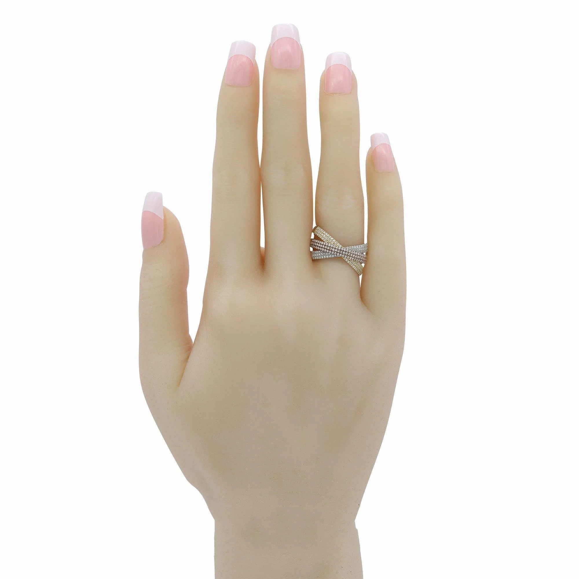 Minimalist 0.6 ct Diamond Ring in 14K Multitone Yellow, White and Rose Gold. The gold weight is 5.8 grams. This elegant, handcrafted design is a distinct piece showcasing three diamond-lined wraps around the bypass. Current ring size is 7 but can be readjusted.