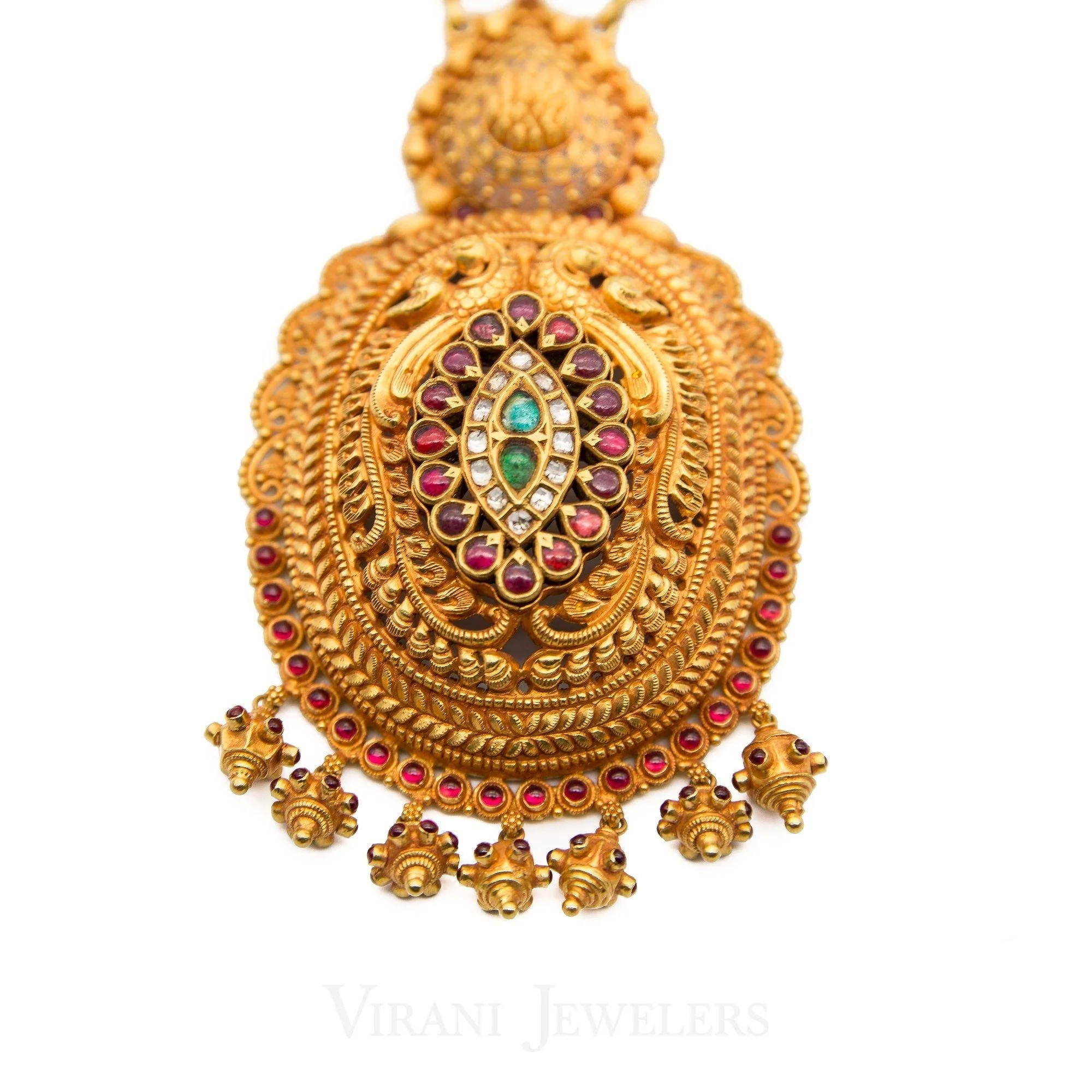 This is a 22K antique gold-finish ruby, Kundan, and emerald stones necklace with an Indian design. This antique Indian ruby necklace is alterable with a snare closure. It has a gold weight of 150.8 grams.