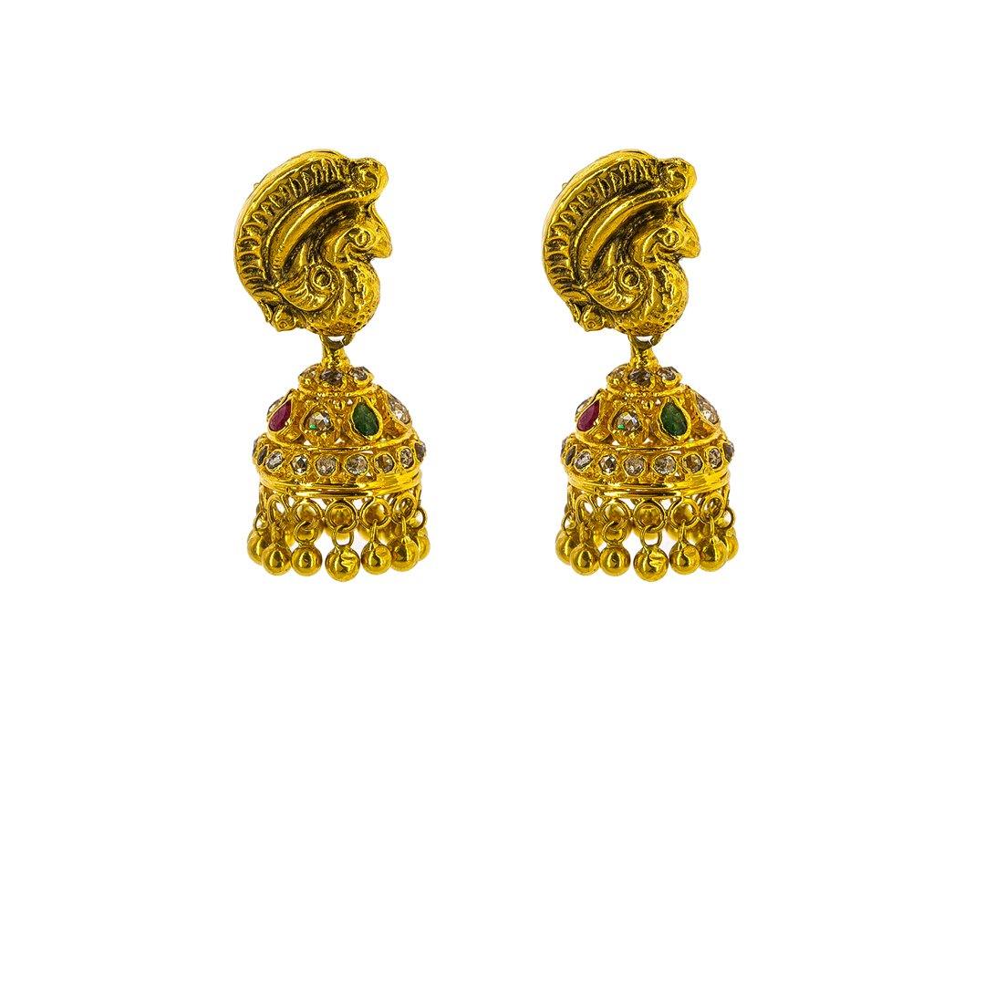 22K Yellow Gold Uncut Diamond Laxmi Necklace & Jhumki Earrings Set W/ 12.05ct Uncut Diamonds, Rubies, Emeralds & Drop Pearls for women. This exquisite 22K yellow gold set is embellished with 12.05ct uncut diamonds, rubies, emeralds and drop pearls. The design features antique finished Laxmi accents and peacock accents. The necklace is 28 inches long with a width range of 2.5-16.9 mm. The pendant is 77.7 mm long and 60 mm wide. Each Jhumki earring is 33.7 mm long and 14.4 mm wide. This antique Temple set has a total weight of 103.43 grams.