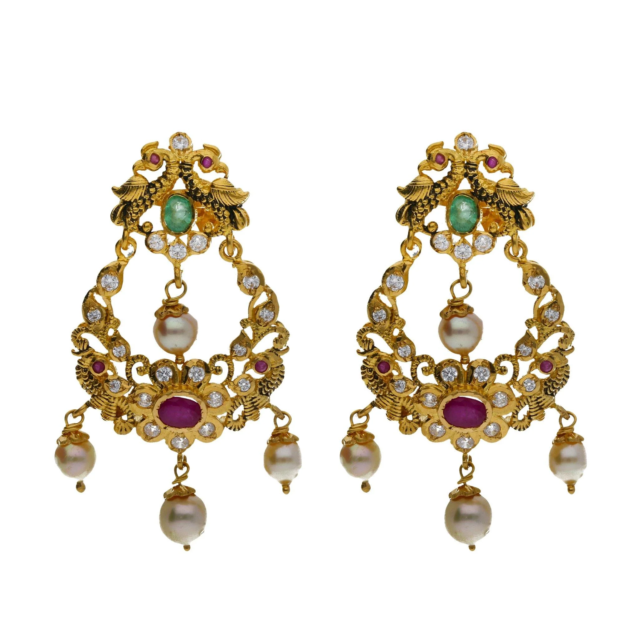 Features: Bring in the boldness to your wardrobe with diverse jewelry pieces from Virani Jewelers extensive collection of fine 22K gold jewelry from designers all over the world. This particular 22K yellow gold Vanki/Choker and chandbali earrings set features an antique finish on yellow gold and a beautiful embellishment of emeralds, Pachi CZ, and an underling of hanging pearls and rubies. The choker features peacock accents darkly etched for a beautiful antique allure. The design also features a beautiful underling of hanging rubies and pearls. This choker can also be worn as an arm Vanki for versatile wear. The Chandbali earrings carry similar darkly finished accents with the addition of drop pearls. Our vast collection of jewelry has more complementary pieces that can be worn along this set to complete the most exquisite statement looks at any special affair. Specifications: |