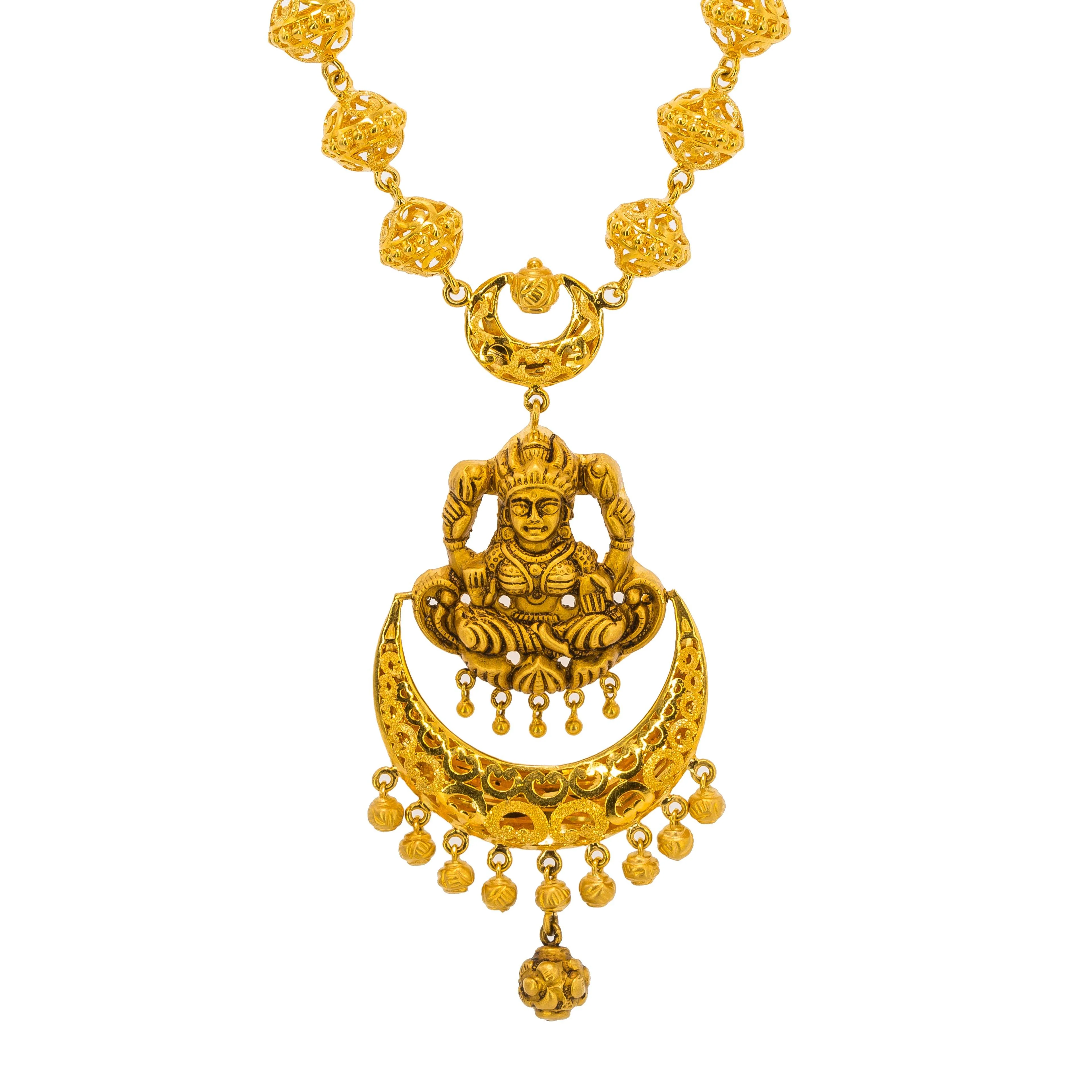 • Jhumki drop earrings Virani Jewelers is always committed to providing only the best in 22K gold jewelry and precious gemstones. This statement 22K yellow gold necklace & earrings set has an antique finish and is beautifully decorated with a strand of yellow gold Hollow mesh beads of varied sizes. The large Laxmi pendant is underlined with a crescent drop accent. The necklace also features a hook-in-eye closure for easy wear. Each Jhumki drop earring features a Laxmi stud and an open cut bell drop. This unique 22K yellow gold set is ideal for traditional attire or as a statement at formal affairs. Browse our exquisite collection for other unique 22K gold Indian jewelry pieces to complement this 22K yellow gold necklace and Jhumki earrings set.