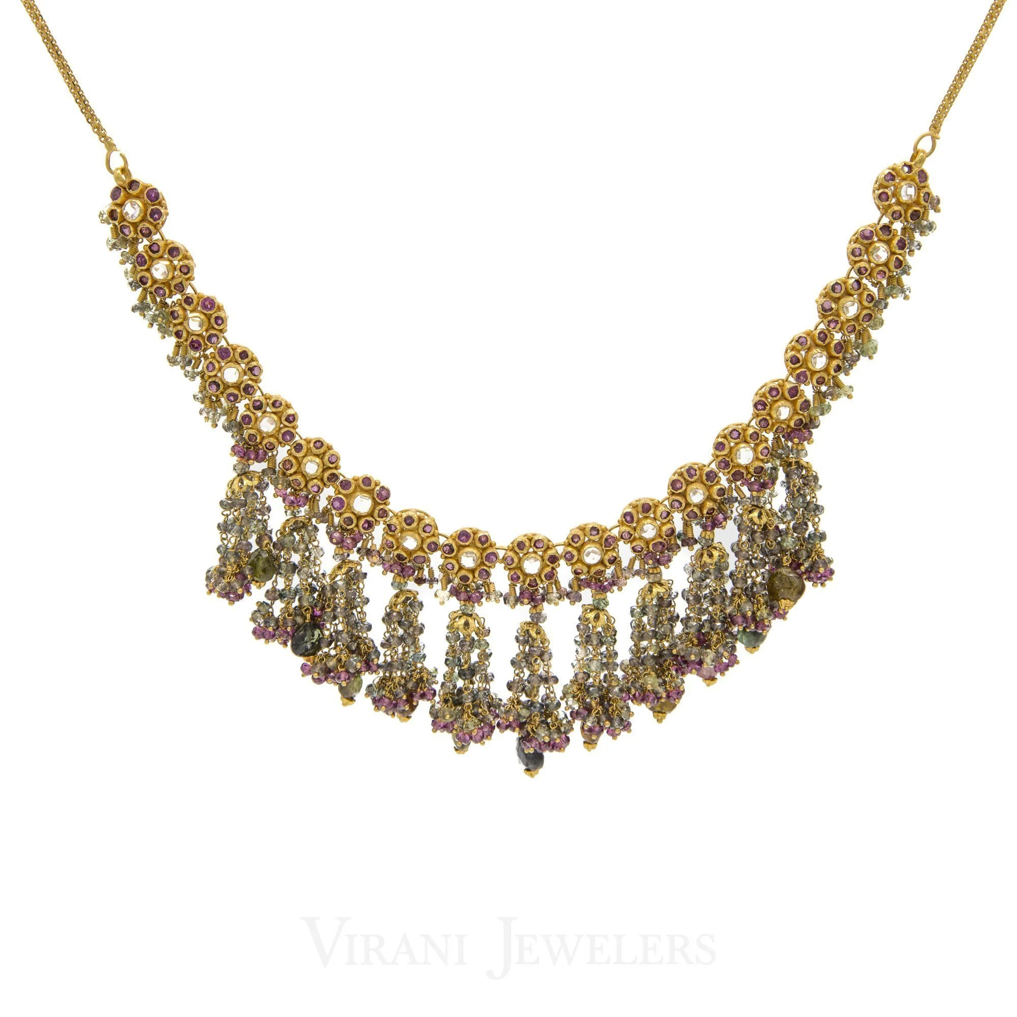 22K Yellow Gold Necklace and Earrings Set W/ Kundan & Floral Chandelier Design